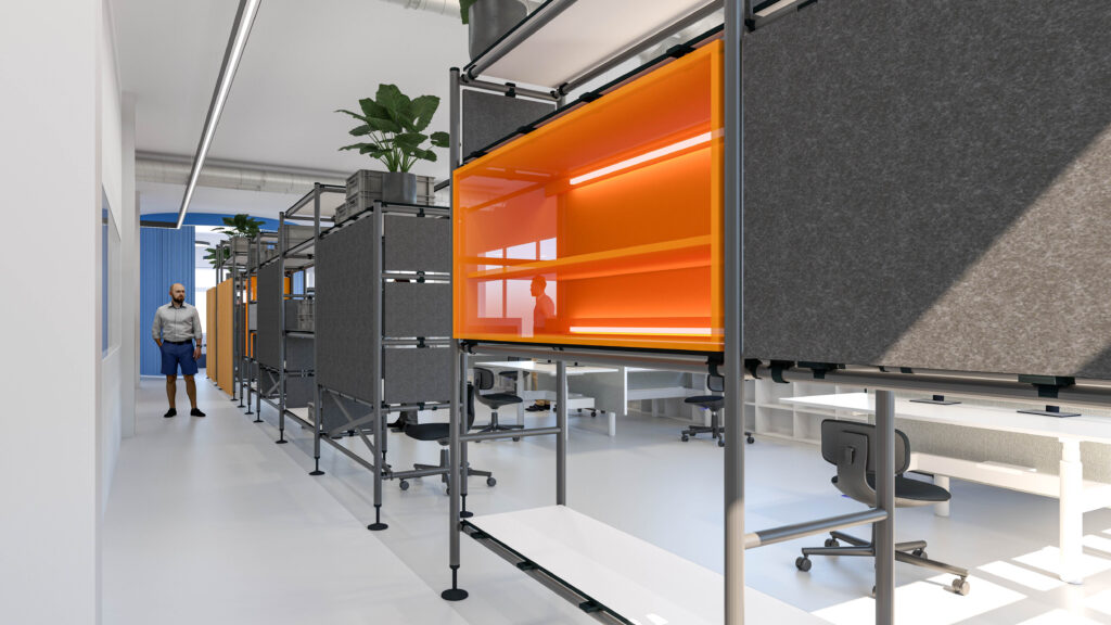 Auf dieser Basis entstand ein Zonenkonzept, das fokussierte Entwicklung, Austausch, Prototyping und informelle Begegnungen klar strukturiert und dennoch maximale Flexibilität zulässt. Anschliessend erarbeiteten wir das detaillierte Design samt Kostenrahmen. Für die Umsetzung arbeiteten wir mit dem Kistler-Partnerarchitekten zusammen, der den Bau und die Arbeiten vor Ort verantwortete, während wir Planung und Gestaltung bis zur Ausführung begleiteten.