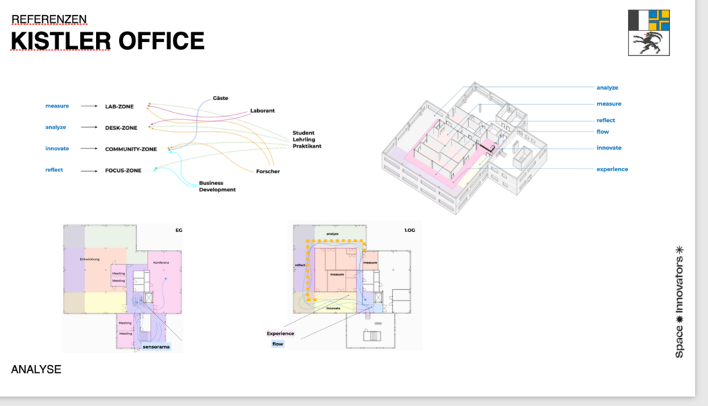 In einer ersten Phase arbeiteten wir mit einer Kernprojektgruppe aus der F&E, die die gesamte Abteilung repräsentierte. Mit Personas und kurzen User Journeys haben wir den Alltag der Teams analysiert und ihre räumlichen Bedürfnisse präzise herausgearbeitet. Parallel entwickelten wir eine „spatial story“, die die Werte von Kistler und die Abläufe in der F&E räumlich übersetzt.